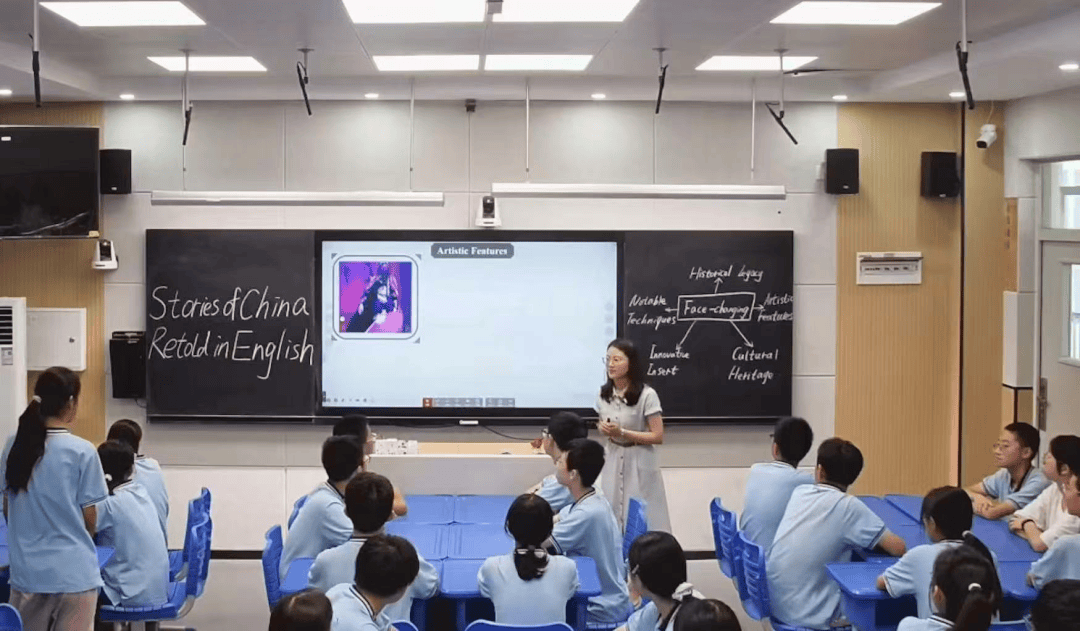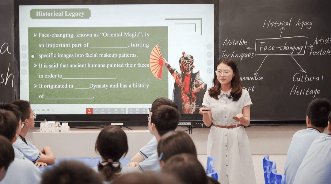 吳老師通过川剧变脸玩偶引入话题,瞬间吸引学生注意力。她演示并讲解川剧变脸的技艺,让学生直观感受非遗匠心。吳老師借课堂分享让学生感受非遗价值,这一过程也以生动方式用情用力讲好中国故事,助力年轻一代传承中华优秀传统文化。