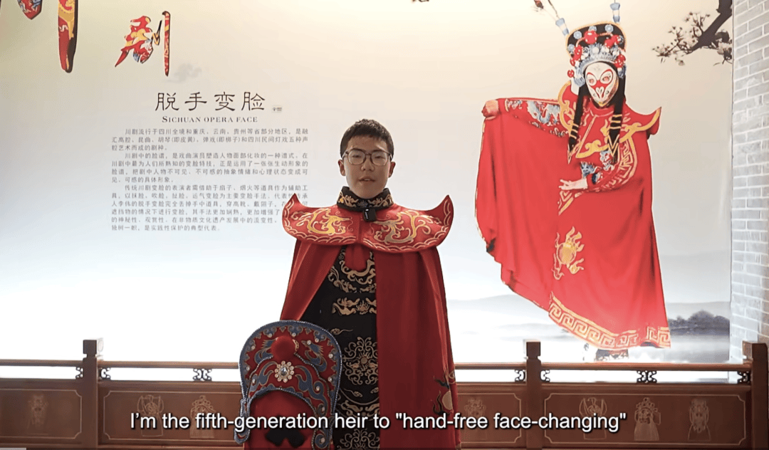 张颂阳和王雨馨共同创作的作品,以生动的形式讲述了川剧变脸这门非遗技艺的独特故事。其中,张颂阳同学有着特殊的身份 —— 他是脱手变脸的第五代传人,这份传承者的视角让作品更具深度与温度。在作品里,两人不仅展现了川剧变脸瞬息换脸的神奇技艺,还融入了张颂阳从小接触变脸、学习传承的亲身经历。通过这些内容,作品既让观众感受到川剧变脸的藝術魅力,也传递出年轻一代对非遗文化的坚守与热爱。